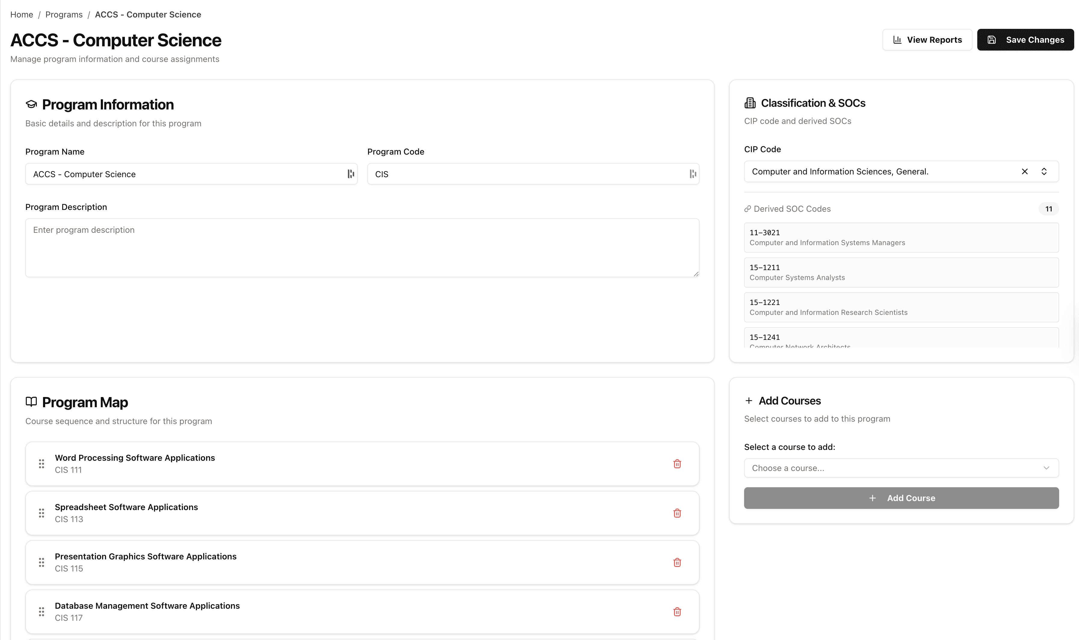 Access reports at every level - programs, courses, instructors, and credentials - to support both system-wide planning and departmental curriculum design.